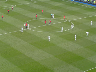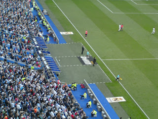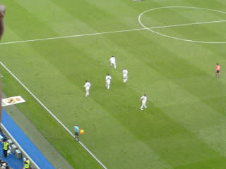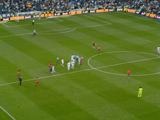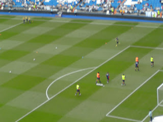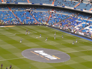 Legelőször a játékvezető, Matéu Lahoz és a két segítője futott pár hosszt a gyepen, aztán fújólások és fütyülés kereszttüzében előbújtak a paplonaiak is. Amikor az első fehér mezes kitette a lábát a műfűre, éljenzés és tapsvihar tört ki az összes madridista szimpatizánsból. A Madrid a túlsó térfélen melegített be, de azért nagyjából ki tudtam venni, hogy ki kicsoda, ami azért nem volt egyszerű, mert nem a mez, hanem ugyanolyan edzőpóló volt mindegyikükön. (Bemelegítés alatt többek között ez és ez a zene szólt ) Valahogy hihetetlennek tűnt, hogy a másik térfélen az a sok kék pólós manus a Real Madrid csapata teljes életnagyságban és szélességben.