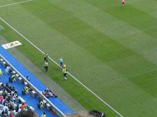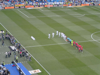 A szívem majd kiugrott a helyéről, amikor végre bebocsátást nyertem a mennyországba az ellenőrzés után. Elmenetem venni magamnak egy kólát – a stadionon belül piszok drága, viszont bevinni innivalót nem lehet – és megkerestem a helyemet. Minden egyes szinten állt néhány sárga mellényes figura – őket mindig látni, amikor a félidők vége előtt 5 perccel tömött sorokban indulnak le a pálya szélére - , akik készséggel segítenek a szurkolóknak megtalálni a saját helyüket. Én a harmadik szinten ültem, a Fondo Norte részen, picikét a „kanyarban” és tökéletesen lehetett onnan is mindent látni, mert ez nem Barcelona, ahol a másodiktól feljebb már a kivetítőre kell hagyatkoznia az embernek. A helynek csak az a hátránya volt – attól eltekintve, hogy egész magasan volt - , hogy felettünk voltak a vendégszurkolók és élvezettel hajígáltak papírgalacsinokat ránk, ha át tudták az elválasztó hálón nyomkodni a golyóbisokat. Küldtem pár sms-t, hogy a barátaim megsárguljanak az irigységtől, aztán figyeltem, ahogy lassan kezdett megtelni a lelátó. Drága expasim akkor se akart leszállni rólam, így kinyomtam a telefont és csak arra koncentráltam, hogy minél inkább az emékezetembe véshessem minden percét az ottlétemnek. Az eredményjelzőként is funkcionáló kivetítőn reklámokat és kisfilmeket mutattak végig, amikor a Nessun Dorma alfestésével készített videó ment a dicsőséges múltról elkapott a sírás. A mellettem helyet foglaló srác, akit Alvaronak hívtak, Malagaból érkezett és Pipita mezben volt, rögtön a kezembe nyomott egy papírzsebkendőt, aztán beszélgetni kezdtünk és egész addig csevegtünk is, amíg ki nem jöttek a csapatok melegíteni.