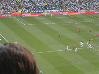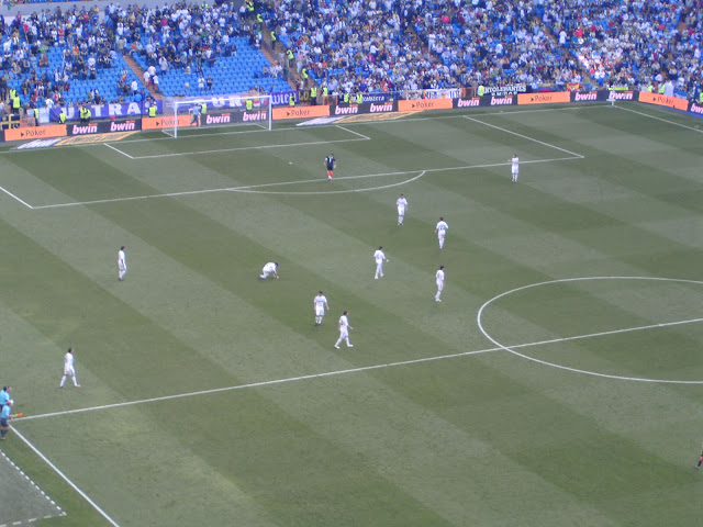 Azelőtt életembe nem voltam ennyire közel Madrid játékoshoz, szóval teljesen kész voltam. A 6. percben már vettük a levegőt, hogy az Ultras Surral és a 5 Estrellas Peñaval közösen rákezdjünk a 7. percben szokásos „ Illa, illa, illa, Juanito maravilla!” ( Csodálatos Juanito)rígmusra, amikor Albiol nagyon csúnyán elszúrt egy hazaadást és Aranda a menteni igyekvő Ikeren túljutva berúgta a vezető gólt. Dermedt csend lett úrrá a Bernabéun, de amint lejebb hagyott a döbbenet az Ultras Sur rákezdett a dalok és rígmusok tömkelegére, mi pedig úgy gondoltuk Alvaroval, hogy még ha egyedül is csináljuk a szektorban, de mi is szurkolni kezdünk, végtére is ezért mentünk oda. A jó példa pedig ragadós, mert nem telt bele 5 perc már az egész karéj együtt ugrált ritmusra a „ Todo el estadio, debe cantar” ( Mindenkinek a stadionban énekelnie kell) kezdetű rígmusra. A Fiúk pedig nem hagytak minket cserben, mert a 25. percben Cristiano Ronaldo kiegyenlített, a szpíker kezdeményezésére pedig torkunk szakadtából ordítottuk a „Gol de Cristiano”-ra feleltképp, hogy Ronaldo.