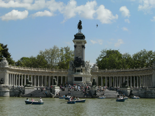 Innen az utam a Puerta del Alcalához vitt, erről is készítettem pár fotót, majd bementem a Parque del Buen Retiro díszes főbejáratán. Május másodika is ünnepnap volt (Madrid város napja) és vasár- és ünnepnap lévén minden madridi kijött a parkba. A sétányok, padok és a csónakázó tó tele volt emberekkel. Madrid egyébként az egyik legzöldebb város, az biztos. Hiába nagyobb ott a forgalom, mint pl. Budapesten, mégis sokkal tisztább ott a levegő, mert még a legnagyobb sugárutak mentén is rengeteg fa és bokor található nem is beszélve a sok kis parkról, zöld területről a házak között. De visszatérve a Retirora, ott minden kisebb „téren” szökőkút áll, a sétányok mentén pedig gesztenyefák nyújtanak árnyékot, amlyek épp akkor virágoztak, amikor ott voltam. Utcazenészek, mutatványosok, bábosok és jégkrémárusok tömkelegét láttam a fák közt sétálva és én is elcsábultam egy fagyira. Leülve az El Estanque partjára nézelődtem, amikor a spanyol légierő 3 vadászgépe húzott el a park felett színes füstöt kibocsátó kütyükkel a gépre erősítve, amivel felrajzolták a spanyol nemezeti színeket az égre. Miután megettem a jégkrémem feltápászkodtam és a Cibeles felé indultam, de előbb még venni akartam pár képeslapot az egyik ottani újságárusnál. Azontúl, hogy 200 féle madridi képeslapot lehetett kapni, amelyek közül körülbelül lehetetlenség volt választani, mert egyik szebb volt, mint a másik még a Real Madrid játékosok hivatalos fotóival ellátott képeslapokat is lehetett venni! Egyébként akármelyik helyen nézte meg az ember, ahol lehetett képeslapot venni, mindenhol volt ilyen, ami azért nem semmi. Madridban és úgy általában Spanyolországban lehetetlenség kikerülni a focit. Ott az embereknek a hétköznapi életük része a futball, a kedvenc csapatuk. Ezzel kelnek, ezzel fekszenek. Az ország legtöbb példányszámban eladott lapja a Marca, aminek a 90%-a csak a futballal foglalkozik, a leghallgatottab rádióműsor pedig az El Larguero, ami a Cadena Ser csak a focival foglalkozó 1 órás adása. Úgy gondolom, hogy ez teljesen helyénvaló abban az országban amelynek válogatottja a regnáló Európa- és Világbajnok és abban a városban, ahol a világ legjobb csapata székel...