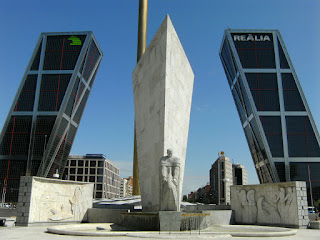 Ránéztem az órámra és megváltoztatva az előzetes utitervemet, próba szerencse alapon a Mirasierra Hotelhez indultam. Pellegrini edzősködése alatt a hazai meccsek előtt a játékosoknak csak a meccs napjának délelőttjén kellett megjelenniük az összetartáson, nem az azt megelőző este. Én viszont hiába siettem, elég későn értem oda, úgyhogy csak eléggé hátulról tudtam bámészkodni, onnan is csak lábujjhegyen, de messziről volt szerencsém látni Garayt, Granerot, Gagot, Arbeloat, Benzemát és Pipitát. A Knoopers helyett ez volt az, ami egész napos lendülettel látott el, úgyhogy mielőtt a nagy tömeg megindult volna elsiettem a metróhoz és a Plaza de Castilla felé vettem az irányt. Itt található a Puerta de Europa, leánykori nevén a Torres Kio, ami kettő, a függölegeshez képest 15°-kal megdöntött üveg irodaházat jelent és képen is fantasztikus látvány, de élőben még jobb. A 2 épület előtt van egy szökőkút, onnan lehet a legjobb képeket készíteni róla. Miután fotóztam onnan párat a Puerta de Europáról is, meg az ide torkolló Paseo de la Castellanáról is, átsétáltam az egyik szomszédos utcába, ahol épp bolhapiac volt. Venni nem vettem semmit, mert alkudozni magyarul sem tudok, nemhogy spanyolul és különben is mihez kezdtem volna egy porcelán flamenco táncosnővel vagy egy antik lámpaernyővel?