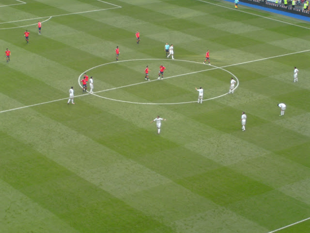 10 perccel a kezdő sípszó előtt mind a két csapat bevonult az öltözőbe, a szpíker pedig elmondta az összeállításokat. Időközben megérkezett az Ultras Sur is, szóval extra adag füttyöt kapott minden Osasuna játékos, lényegében a maroknyi vendégszurkolón kívül mindenki fújoltak őket, ám amikor a hazai csapat összeállítását sorolták, mindeki tapsot kapott, ki nagyobbat, ki kisebbet. Aztán a hangszóróból előkúsztak a Centenáriumi Himnusz – ami szerintem gyönyörű – első hangjai, a pályán pedig megjelent a 2 csapat. Leírhatatlan érzés volt meglátni a Real Madrid kezdő tizenegyét, ekkor éreztem a legjobban, hogy most teljesül életem legnagyobb álma, bár még mindig furcsa volt, hogy a fehér mezes futballisták azok tényleg élőben a kedvenc játékosaim. J Az első félidőben a hozzánk közel eső térfél volt a Madridé, csináltam is pár jó képet Ikerről, ahogy beáll a helyére.