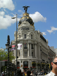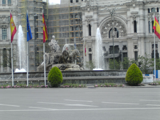 A képeslapok megvétele után átsétáltam a Plaza de la Cibelesre és lefotóztam az akkor épp felállványozott Palacio de Comunicaciones épületét és persze a híres Kübelé kutat, ahol csapat ünnepelni szokott, amikor nyerünk valamilyen címet. Innen indul ki a Gran Vía is, ami K-Ny –i irányban szeli át a fővárost és itt áll Madrid egyik jelképe, a Metropolis épülete is.